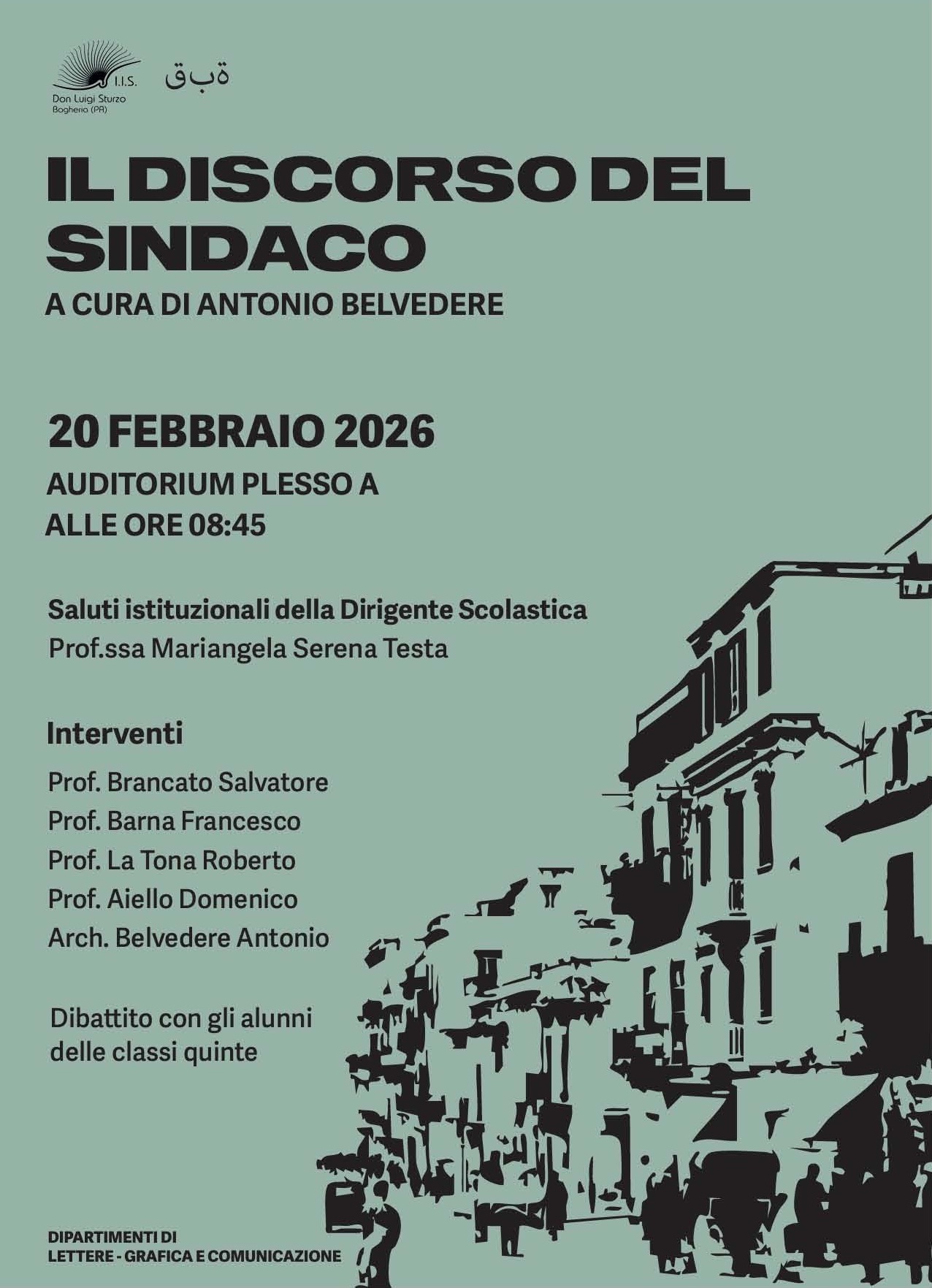Venerdì 20 febbraio 2026, dalle ore 08:45 alle ore 10:45, presso l’Auditorium del plesso A, si terrà la presentazione del volume “Il discorso del sindaco” di Pietro Belvedere.